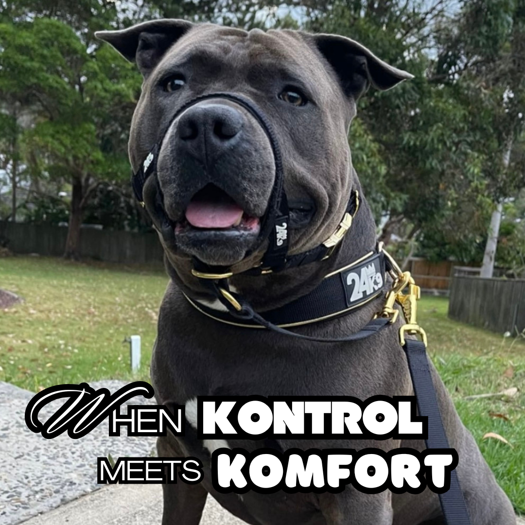 Experience the best of both worlds with the 'When Kontrol Meets Komfort' Set. This set combines the Kontroller Head Halter, Komfort Slip Collar and Komfort Leash - creating an effortless walking experience. It’s designed to prevent pulling and ensure a controlled, comfortable walk for both you and your dog.