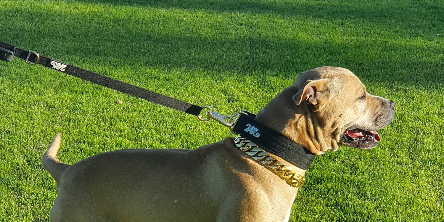 The Kontrol Collar by 24K9 is everything you expect in a collar for your four-legged companion. The unique design, which includes triple polyester layers for durability and an interior with soft neoprene padding, provides comfort and control without sacrificing style. This collar also features gold stainless steel buckles that lock into place to ensure your dog's safety.
